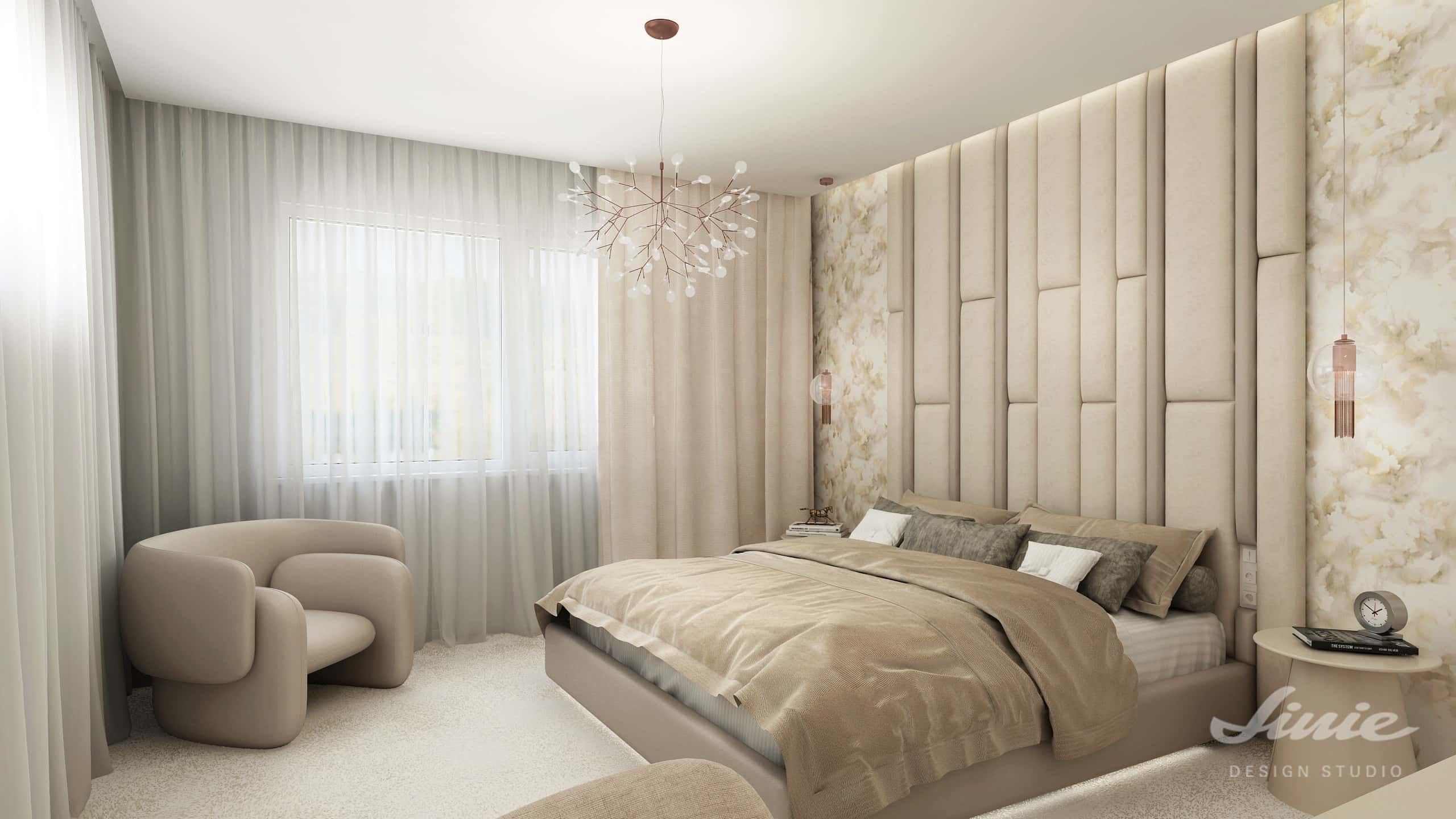 Detail na moderní toaletní stolek s kulatým podsvíceným zrcadlem a čalouněnou stěnou v elegantní ložnici. Návrh od Liniedesignstudio.